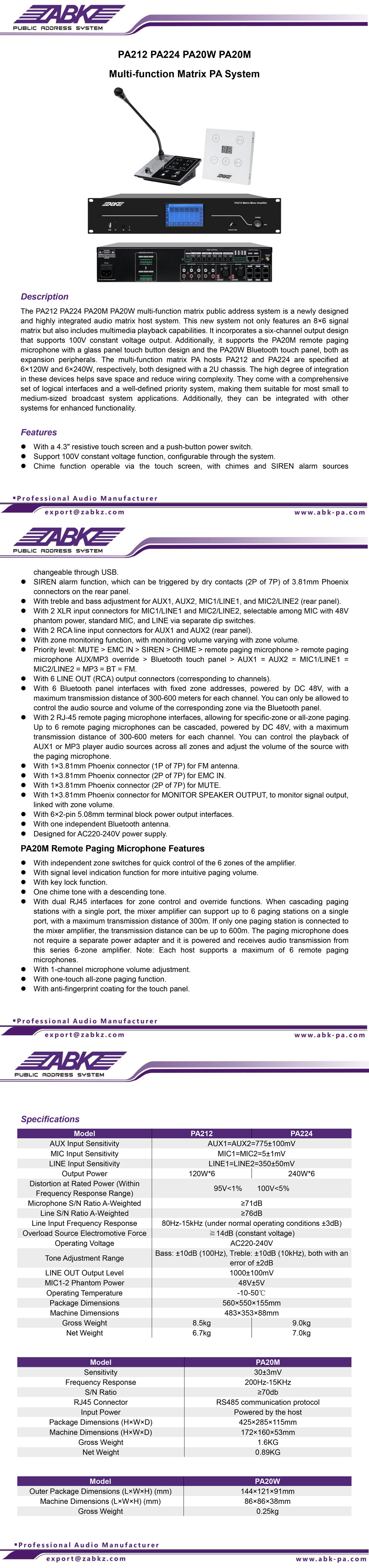 The PA212 PA224 PA20M PA20W multi-function matrix public address system is a newly designed and highly integrated audio matrix host system. This new system not only features an 8×6 signal matrix but also includes multimedia playback capabilities. It incorporates a six-channel output design that supports 100V constant voltage output. Additionally, it supports the PA20M remote paging microphone with a glass panel touch button design and the PA20W Bluetooth touch panel, both as expansion peripherals. The multi-function matrix PA hosts PA212 and PA224 are specified at 6×120W and 6×240W, respectively, both designed with a 2U chassis. The high degree of integration in these devices helps save space and reduce wiring complexity. They come with a comprehensive set of logical interfaces and a well-defined priority system, making them suitable for most small to medium-sized broadcast system applications. Additionally, they can be integrated with other systems for enhanced functionality.