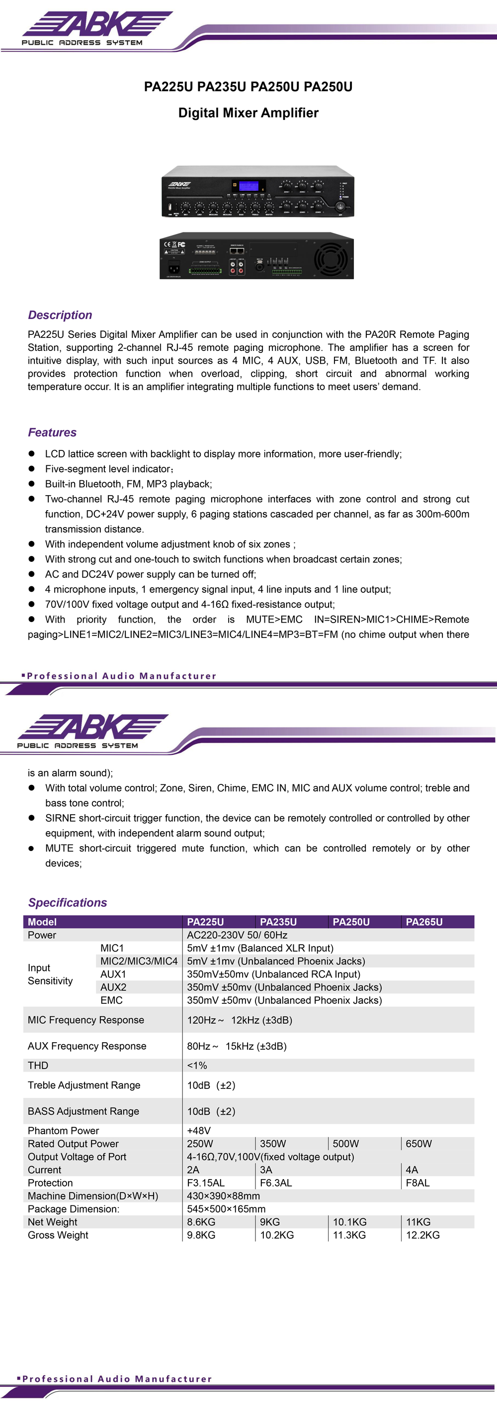 PA225U Series Digital Mixer Amplifier can be used in conjunction with the PA20R Remote Paging Station, supporting 2-channel RJ-45 remote paging microphone. The amplifier has a screen for intuitive display, with such input sources as 4 MIC, 4 AUX, USB, FM, Bluetooth and TF. It also provides protection function when overload, clipping, short circuit and abnormal working temperature occur. It is an amplifier integrating multiple functions to meet users’ demand.