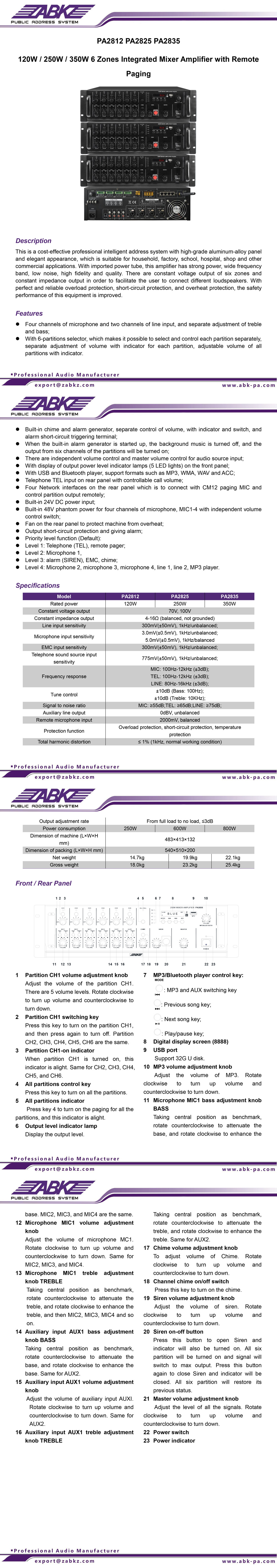 - PA2825 250W 6 Zones Integrated Mixer Amplifier with Remote Paging