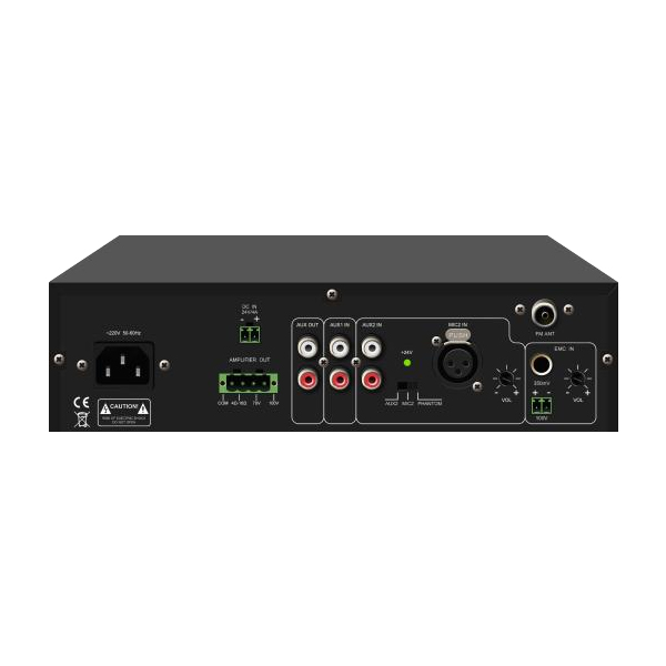 PA35UB/PA60UB/PA120UB corresponds to 35W/60W/120W. The product holds 2 AUX inputs and 1 AUX output. Also, it has 2 MIC inputs. The MIC 1 is a 6.3mm jack on the front panel, and the MIC 2 is a XLR port on the rear panel. The phantom power is available in MIC 2. In addition, it provides individual volume control for each MIC and AUX, and has bass and treble control. What’s more, it has 2 EMC signal inputs (100V/375mV) and 1 EMC output.
