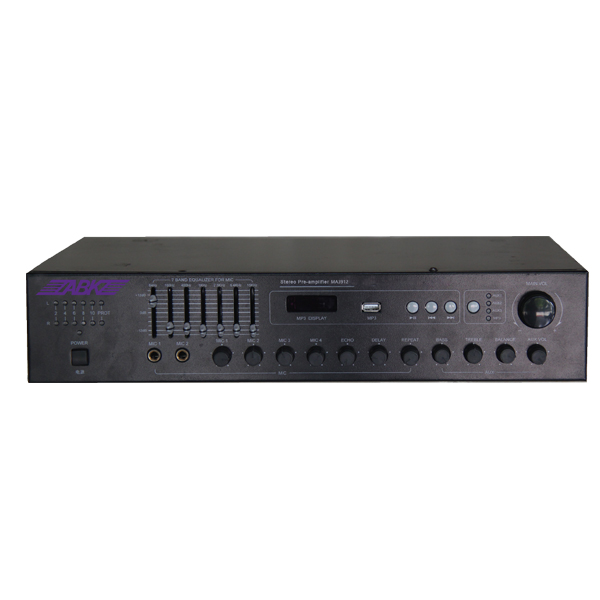 MA3912 amplifier integrates balancing function and pre-amplifier and post amplifier. The series is equipped with three sets of stereo sound source input ports, four microphone input ports, a stereo line output ports, a recording output port and two groups of amplifier output terminals. 3-way stereo sound source channels' volume can be controlled independently cooperating with function of "choose 1 out of 4". Four mics can be controlled independently. Volumes of amplifier output are controlled together. Equipped with seven equal sections, output volume is adjustable.