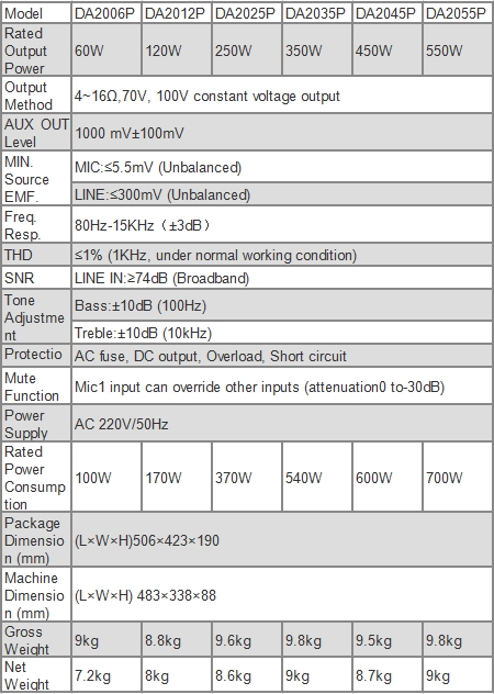 DA2055P meets thedemands of emerging markets to provide high-quality equipment at affffordable prices. And it has a advantage that with mute function, easy to insert priority broadcast. 3 MIC IN, 2 AUX IN, 1 AUX OUT, most suitable for public address. It is suitable for small & medium supermarkets, malls, and indoor places like cafe shop to play background musics.