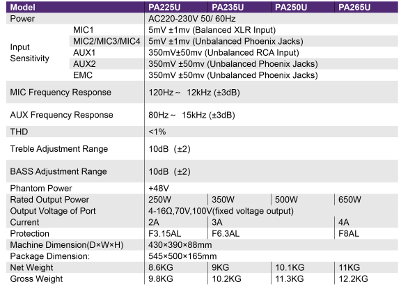 PA225U Series Digital Mixer Amplifier can be used in conjunction with the PA20R Remote Paging Station, supporting 2-channel RJ-45 remote paging microphone. The amplifier has a screen for intuitive display, with such input sources as 4 MIC, 4 AUX, USB, FM, Bluetooth and TF. It also provides protection function when overload, clipping, short circuit and abnormal working temperature occur. It is an amplifier integrating multiple functions to meet users’ demand.